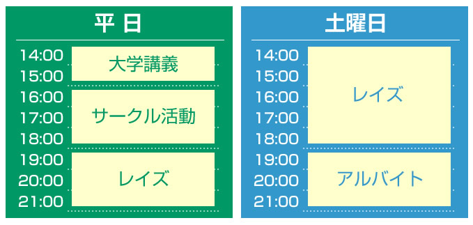 レイズなら、あなたのスケジュールに合わせてアルバイトすることができます。平日は大学やサークルの後に夜からアルバイト。土曜日・祝日は、昼に家庭教師をして、夕方から別のアルバイトなど、柔軟なスケジュール調整ができ、充実した学生ライフを送ることができます。