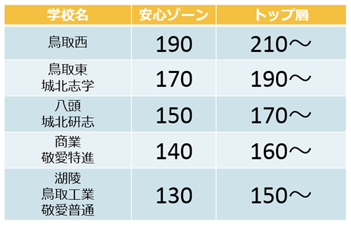 鳥取城北[志学]58 鳥取東[普通]56 鳥取東[理数]56 鳥取敬愛[特進Ⅰ]55 鳥取敬愛[特進Ⅱ]51 八頭[総合]50 八頭[文化]50 八頭[理科]50 鳥取商業[商業]50 |