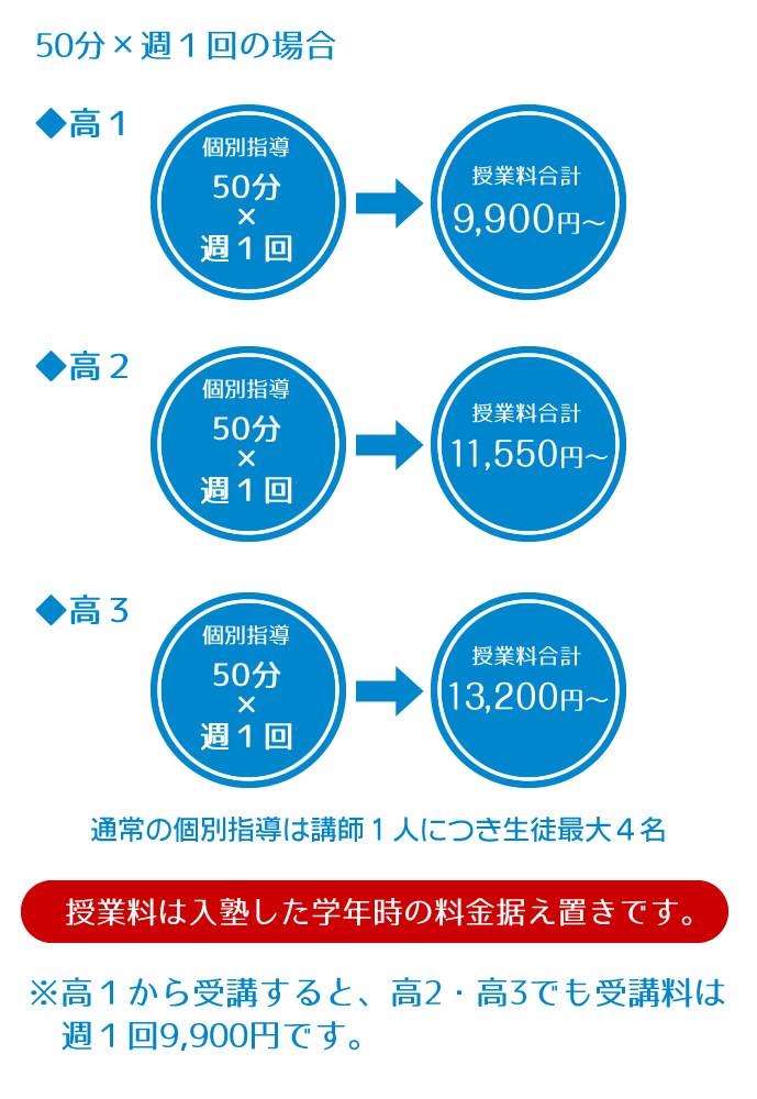 生徒それぞれの習熟度に応じたテキストを用い、学校授業を先取りする形で指導を進めます。必ず前回の復習から入り、知識の定着を確認した上で新しい内容を習得します。